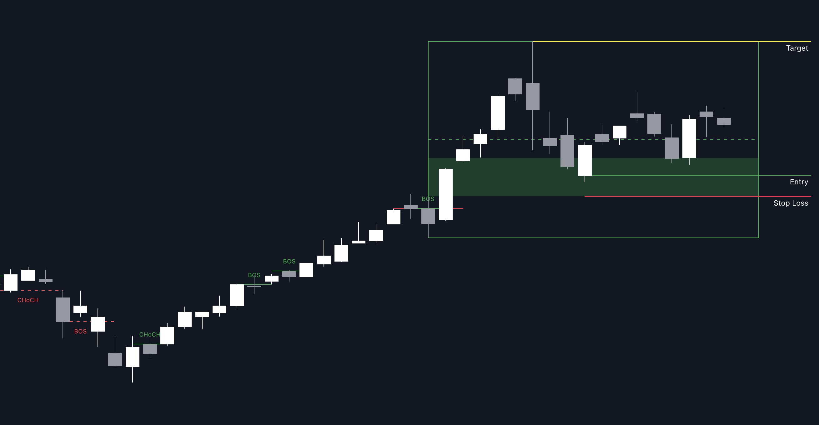 Highlight in-range entry zones using imbalances, pivots, or demand/supply structure.